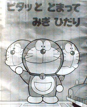 Doraemon cartoon cat admonishing children to look both ways before crossing the street. | Reputed early picture of Doraemon |